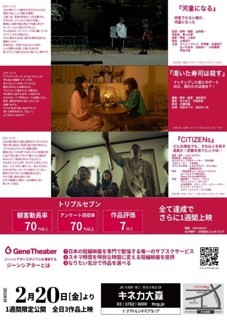 「ジーンシアター」は自主短編映画のサブスク配信サイトで、上映企画「ジーンシアタースタジアム」ではインディーズ短編映画3作品がひとつのプログラムとして上映されます。